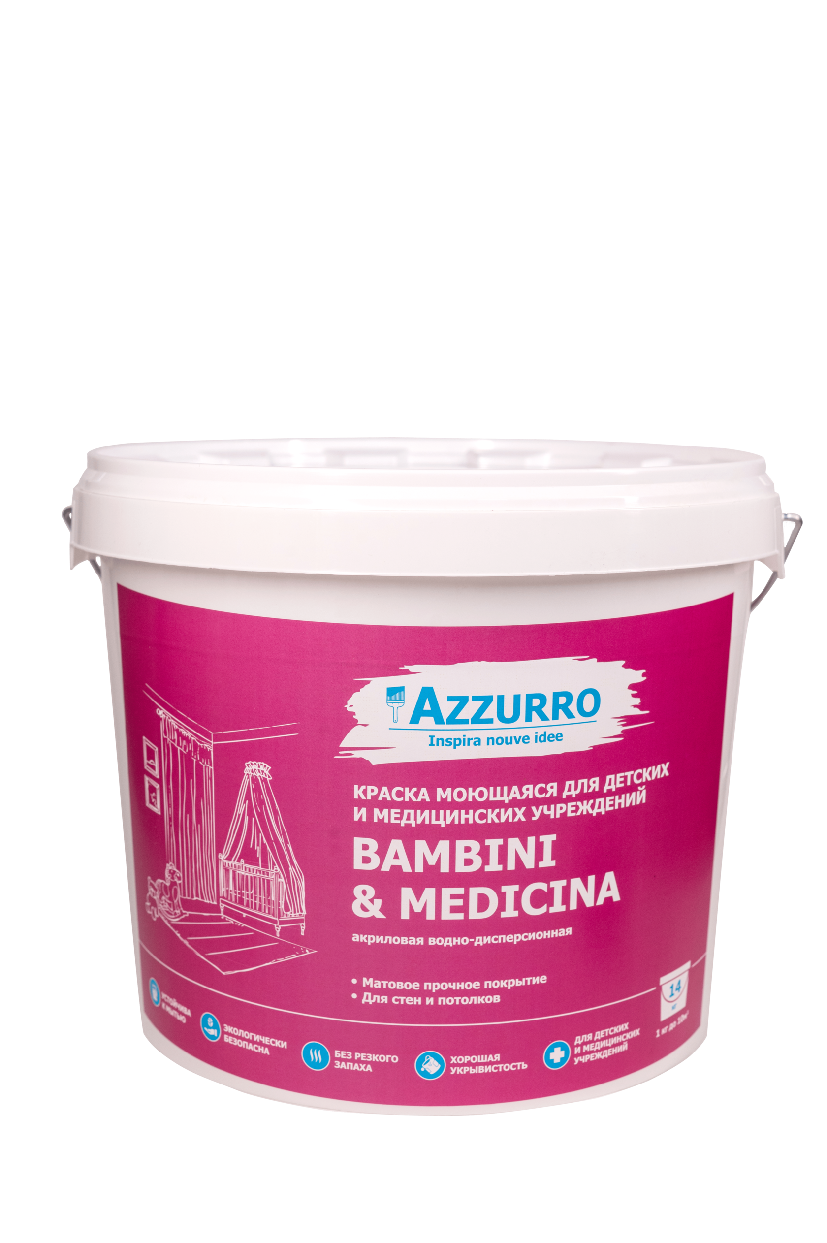 Назначение: краска моющаяся для детских и медицинских учреждений BAMBINI & MEDICINA предназначена для высококачественной окраски стен и потолков внутри сухих помещений и помещений с повышенной влажностью, а также новые или ранее зашпатлеванные, оштукатуренные поверхности из бетона, газобетона, ДСП, ДВП, гипсокартонных плит, кирпича, дерева, обоев. Образует влагостойкое покрытие, устойчивое к легкому мытью мягкой поролоновой губкой с применением бытовых неабразивных моющих средств. Рекомендована для окраски в лечебных, школьных и детских дошкольных учреждениях, и помещениях с предусмотренным режимом влажной дезинфекции.